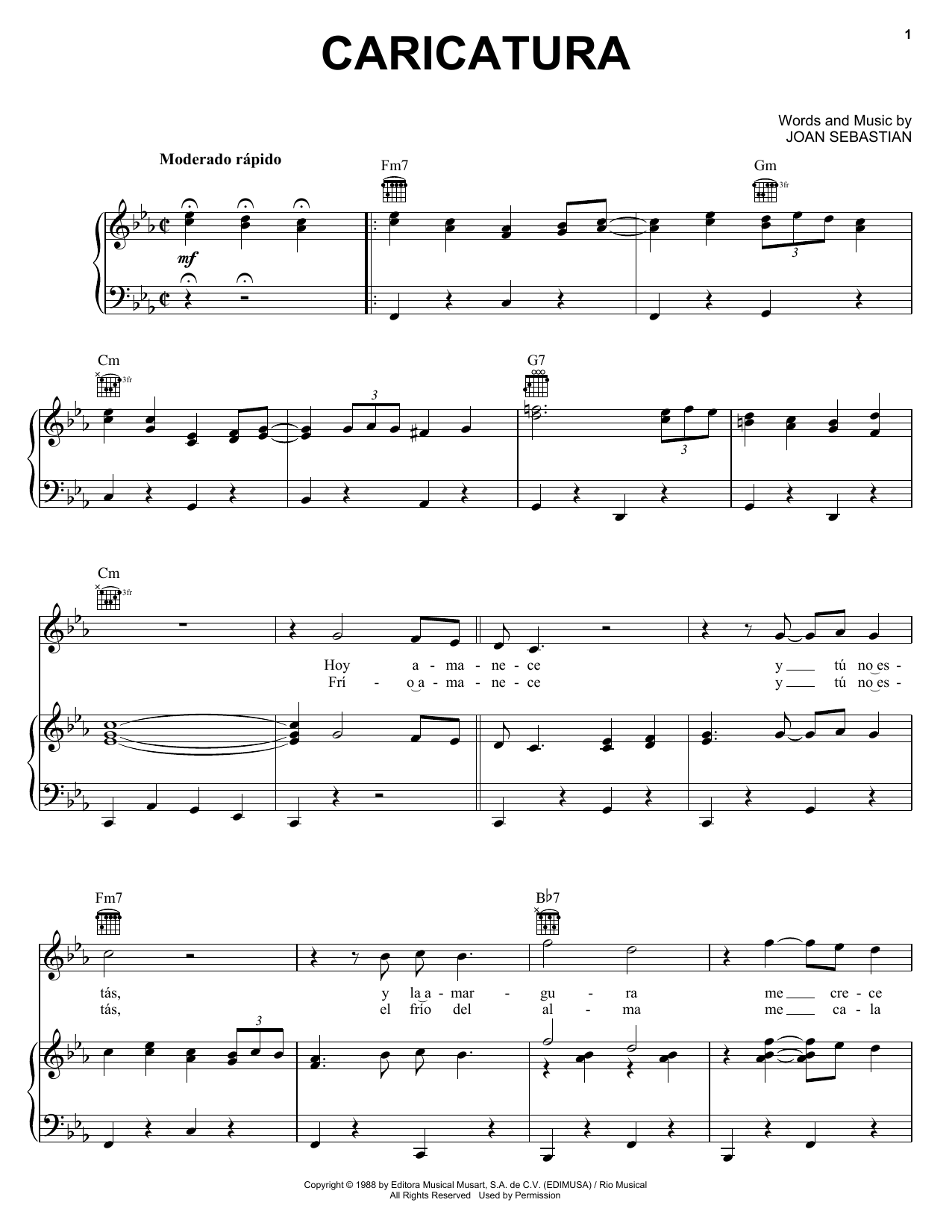 Download or print Joan Sebastian Caricatura sheet music, chords and digital score arranged for Piano, Vocal & Guitar Chords (Right-Hand Melody). This Latin score includes 4 page(s).