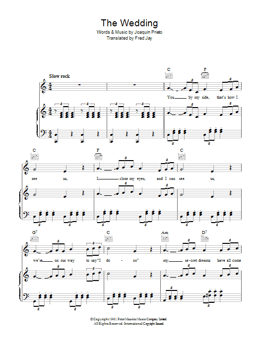 Download or print Joaquin Prieto The Wedding sheet music, chords and digital score arranged for Piano, Vocal & Guitar Chords. This Standards score includes 4 page(s).