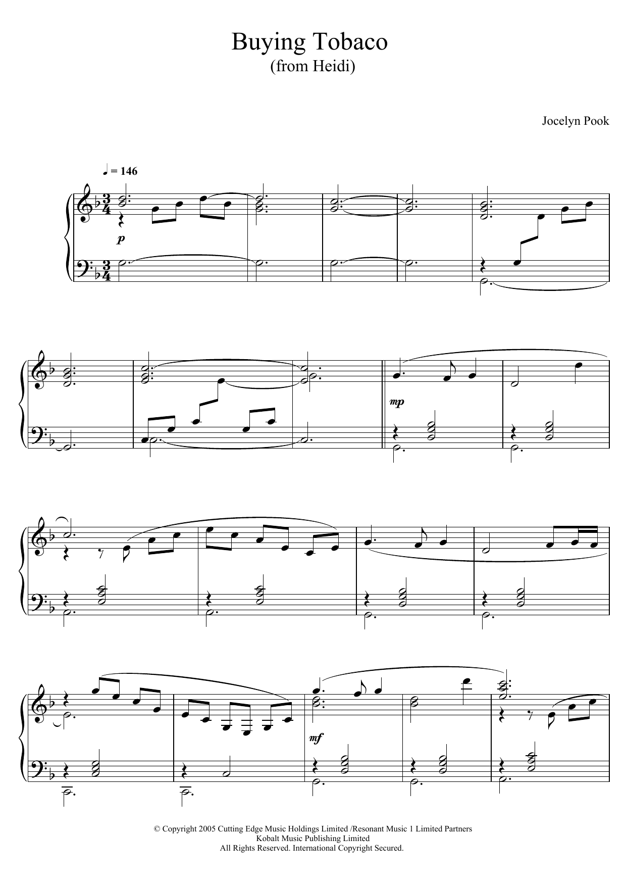 Download or print Jocelyn Pook Buying Tobaco (From 'Heidi') sheet music, chords and digital score arranged for Piano Solo. This Classical score includes 2 page(s).