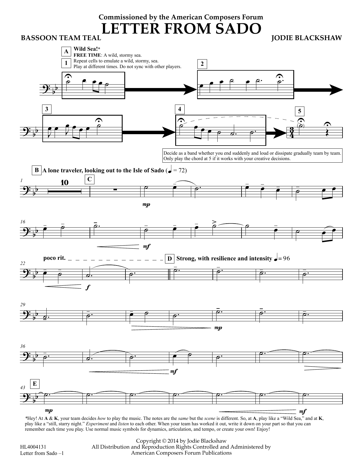 Download or print Jodie Blackshaw Letter from Sado - Bassoon Team Teal sheet music, chords and digital score arranged for Concert Band. This Concert score includes 2 page(s).