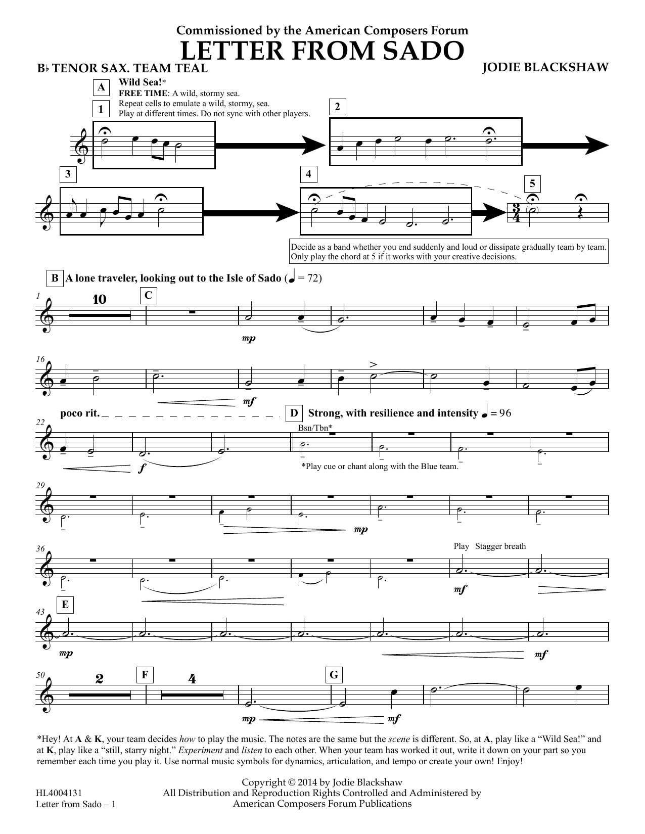Download or print Jodie Blackshaw Letter from Sado - Bb Tenor Saxophone Team Teal sheet music, chords and digital score arranged for Concert Band. This Concert score includes 2 page(s).