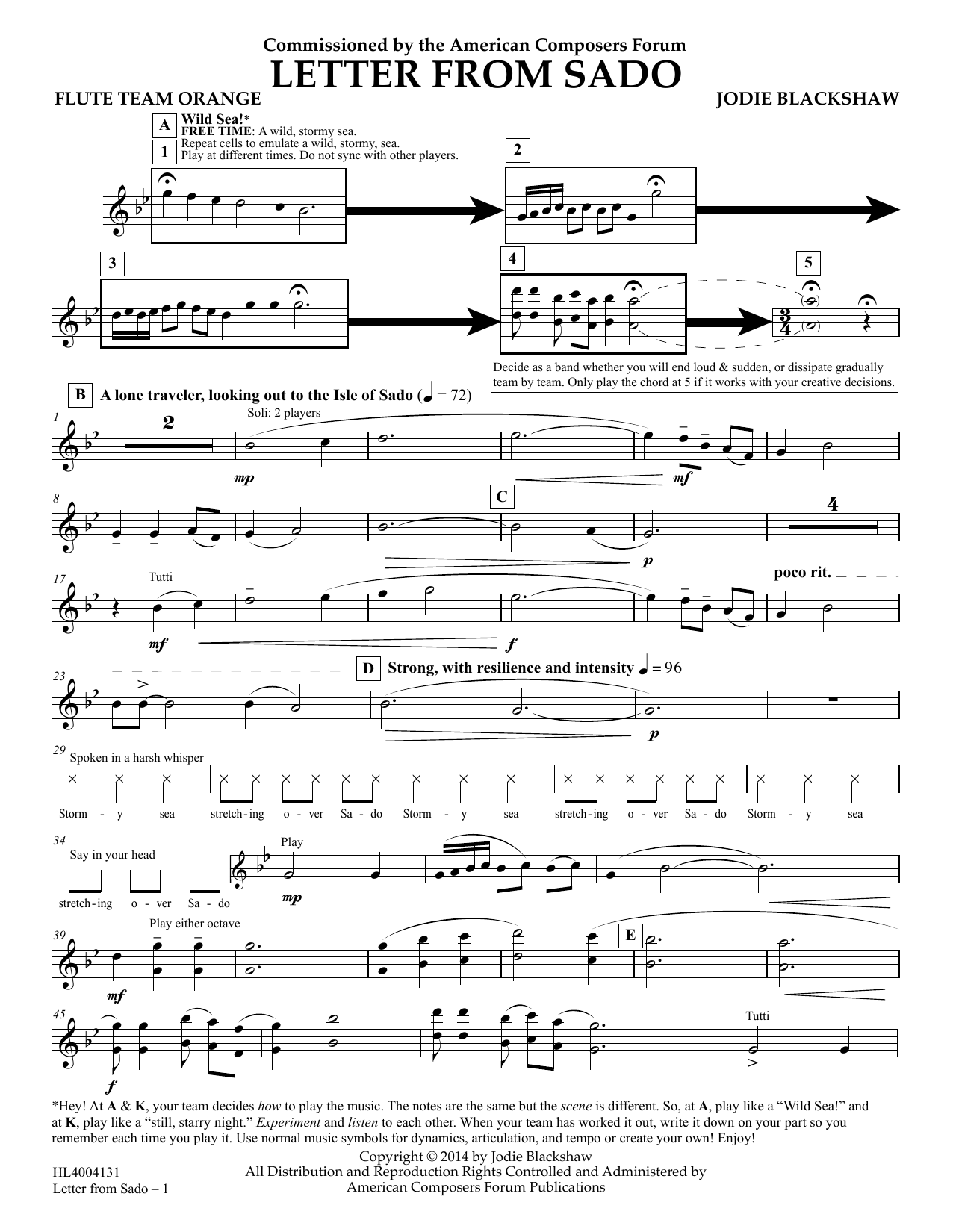 Download or print Jodie Blackshaw Letter from Sado - Flute Team Orange sheet music, chords and digital score arranged for Concert Band. This Concert score includes 2 page(s).
