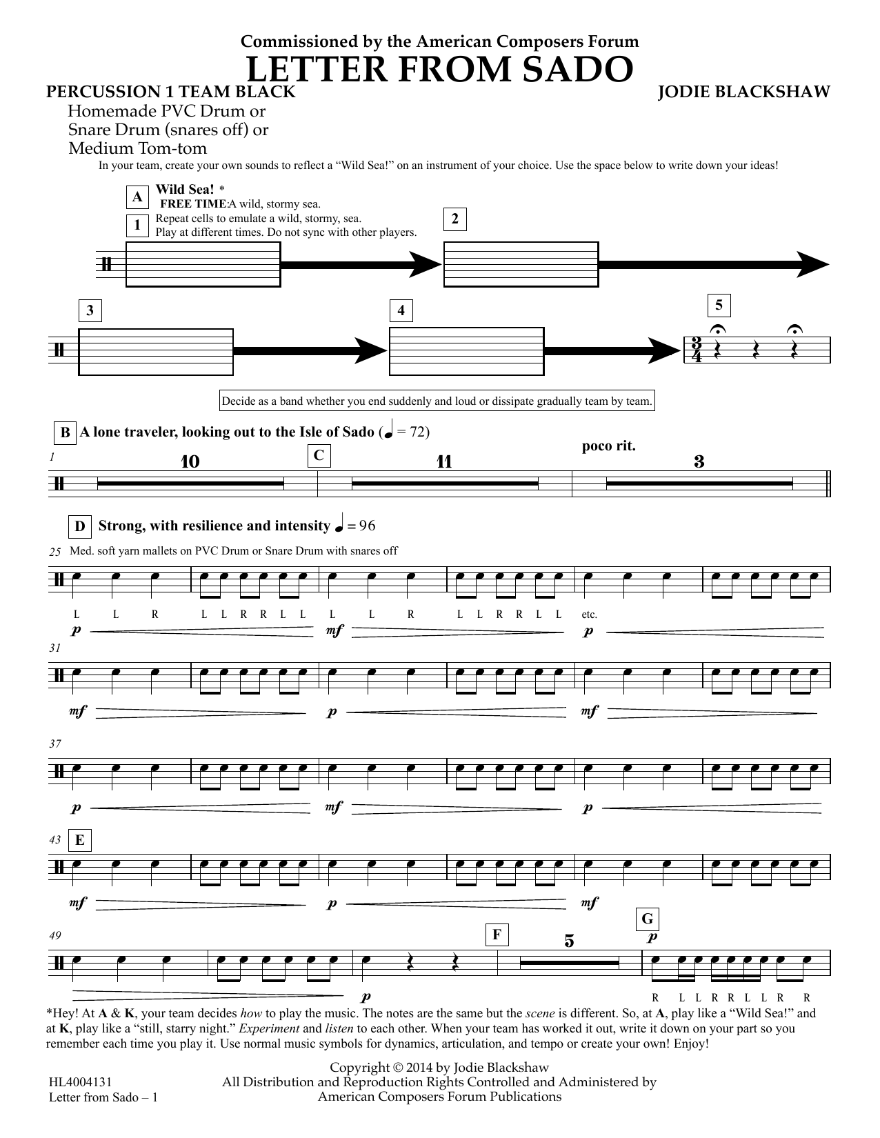 Download or print Jodie Blackshaw Letter from Sado - Percussion 1 Team Black sheet music, chords and digital score arranged for Concert Band. This Concert score includes 2 page(s).