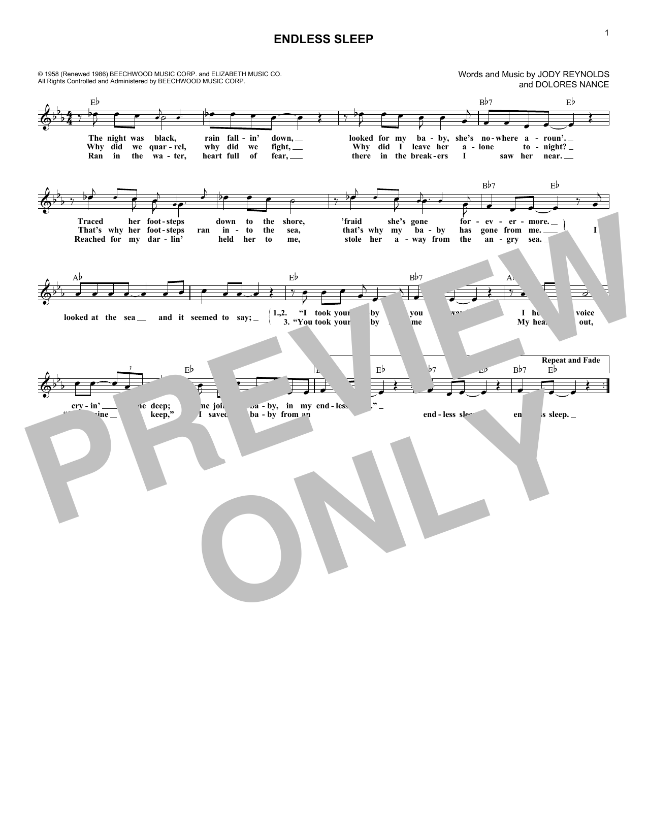 Download or print Jody Reynolds Endless Sleep sheet music, chords and digital score arranged for Lead Sheet / Fake Book. This Pop score includes 1 page(s).