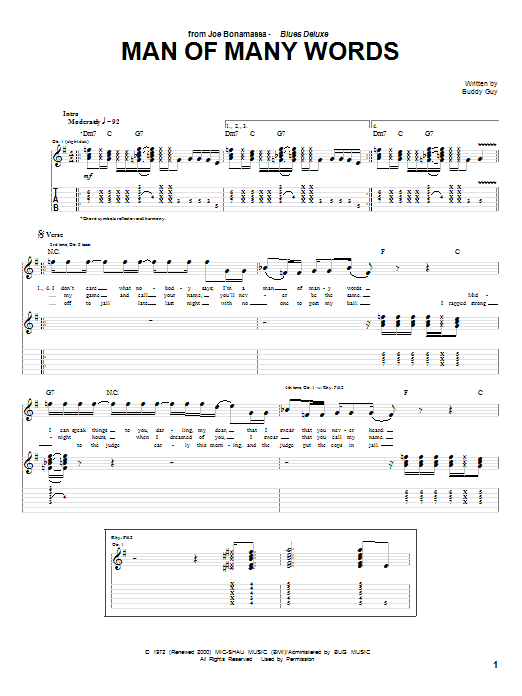 Download or print Joe Bonamassa Man Of Many Words sheet music, chords and digital score arranged for Guitar Tab. This Pop score includes 8 page(s).