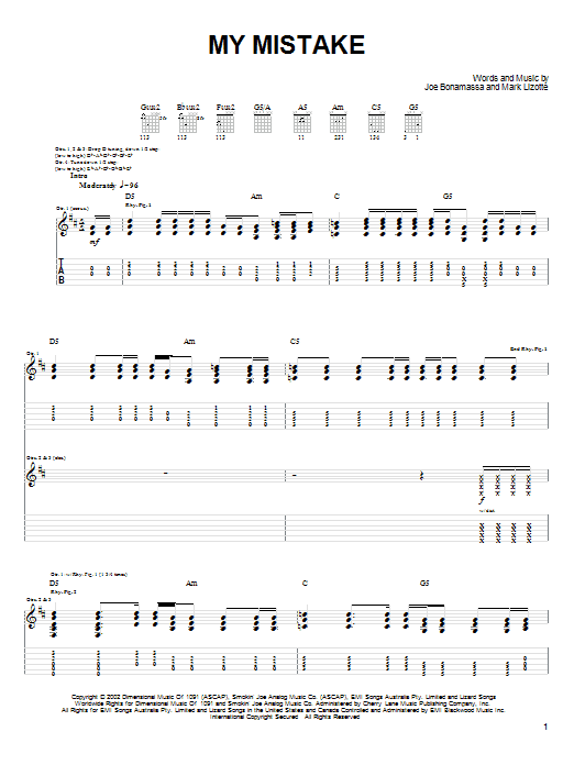Download or print Joe Bonamassa My Mistake sheet music, chords and digital score arranged for Guitar Tab. This Blues score includes 10 page(s).