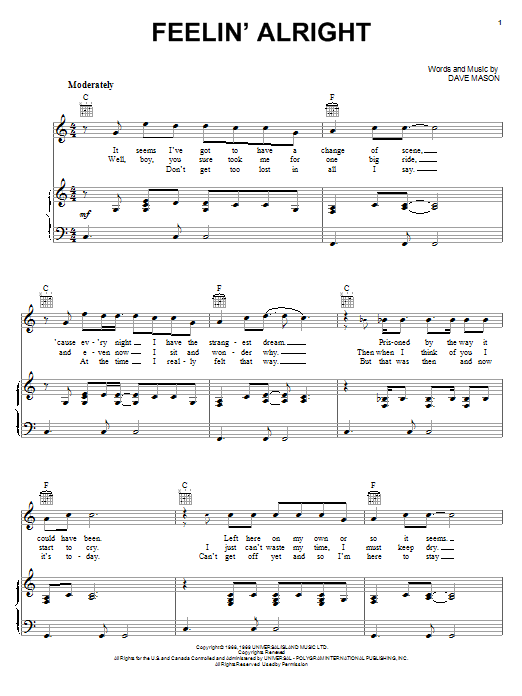 Download or print Joe Cocker Feelin' Alright sheet music, chords and digital score arranged for Piano, Vocal & Guitar Chords (Right-Hand Melody). This Pop score includes 4 page(s).