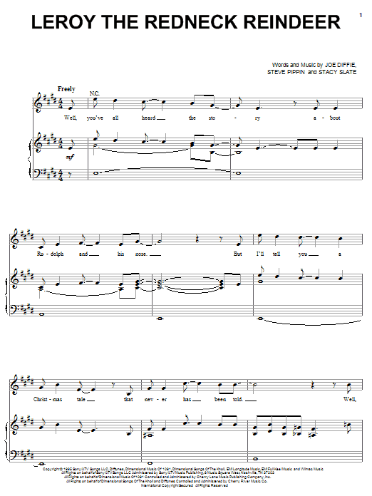 Download or print Joe Diffie Leroy The Redneck Reindeer sheet music, chords and digital score arranged for Piano, Vocal & Guitar Chords (Right-Hand Melody). This Christmas score includes 9 page(s).