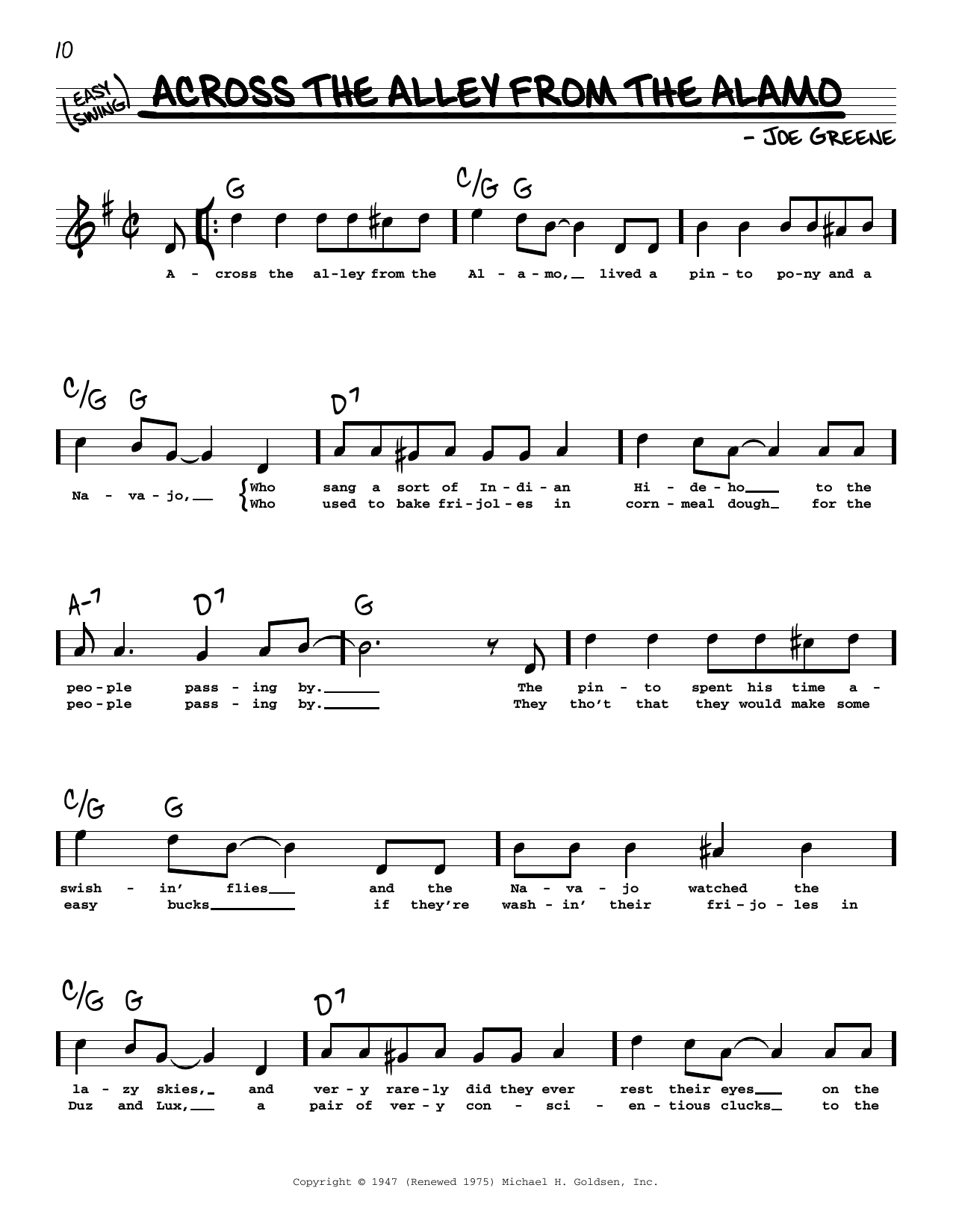Download or print Joe Greene Across The Alley From The Alamo (High Voice) sheet music, chords and digital score arranged for Real Book – Melody, Lyrics & Chords. This Jazz score includes 2 page(s).