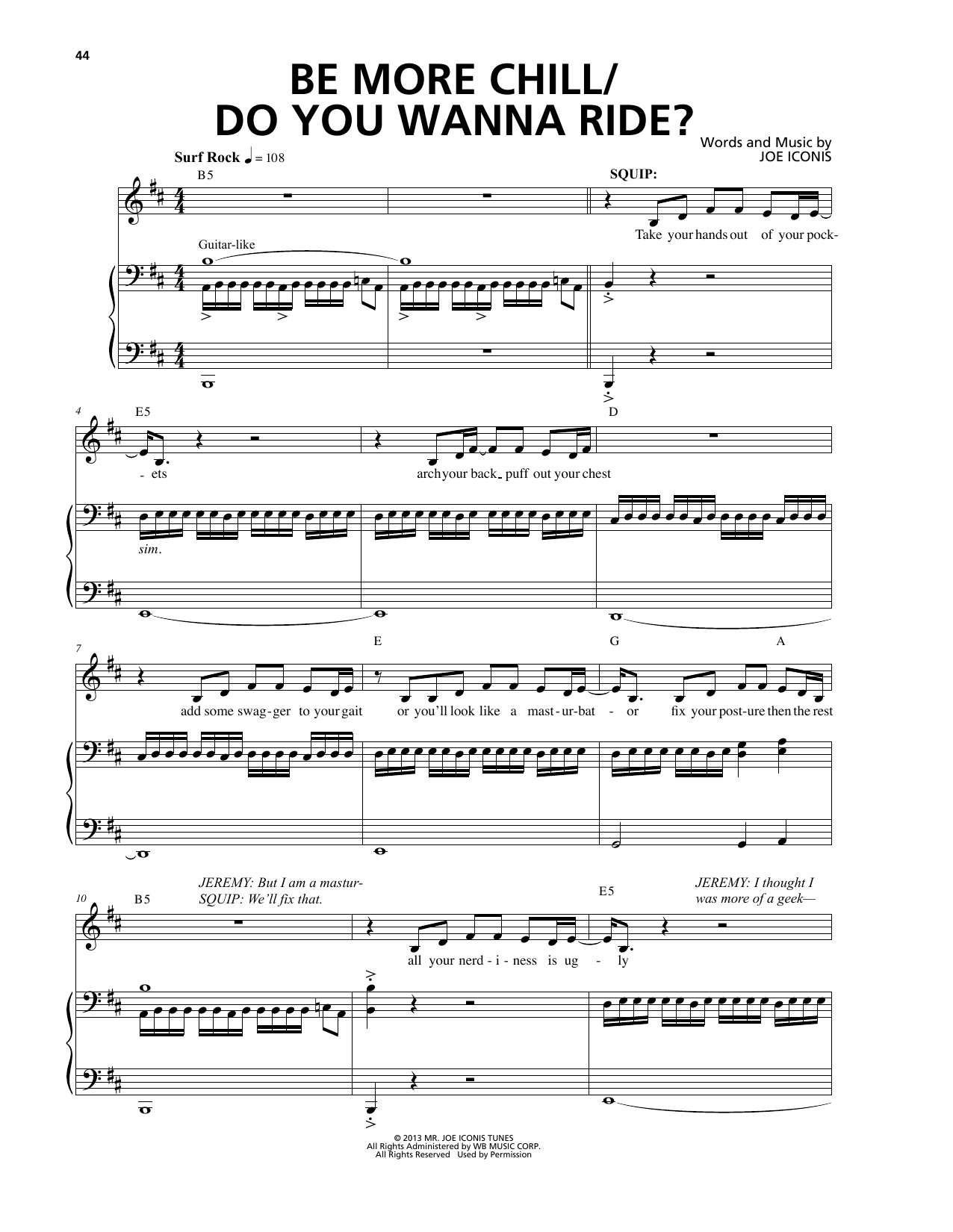 Download or print Joe Iconis Be More Chill / Do You Wanna Ride? (from Be More Chill) sheet music, chords and digital score arranged for Piano & Vocal. This Musical/Show score includes 12 page(s).
