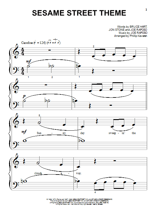 Download or print Joe Raposo Sesame Street Theme (arr. Phillip Keveren) sheet music, chords and digital score arranged for Beginning Piano Solo. This Children score includes 2 page(s).