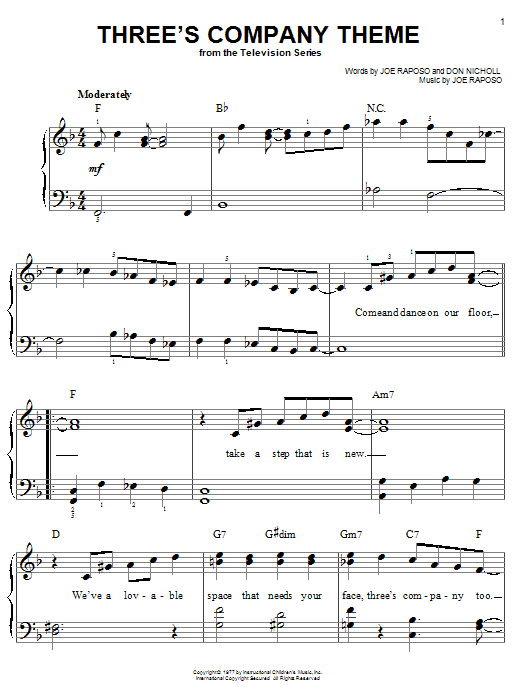 Download or print Joe Raposo Three's Company Theme sheet music, chords and digital score arranged for Easy Piano. This Film/TV score includes 3 page(s).