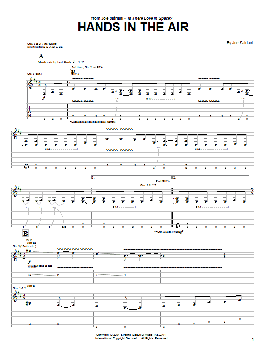 Download or print Joe Satriani Hands In The Air sheet music, chords and digital score arranged for Guitar Tab. This Metal score includes 8 page(s).