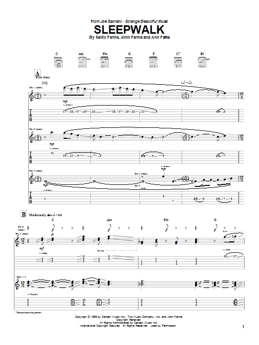 Download or print Joe Satriani Sleepwalk sheet music, chords and digital score arranged for Guitar Tab. This Oldies score includes 7 page(s).