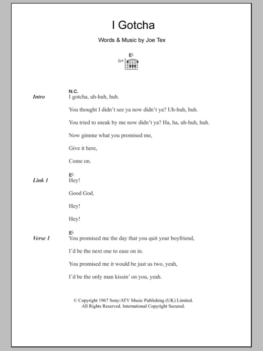 Download or print Joe Tex I Gotcha sheet music, chords and digital score arranged for Guitar Chords/Lyrics. This Blues score includes 3 page(s).