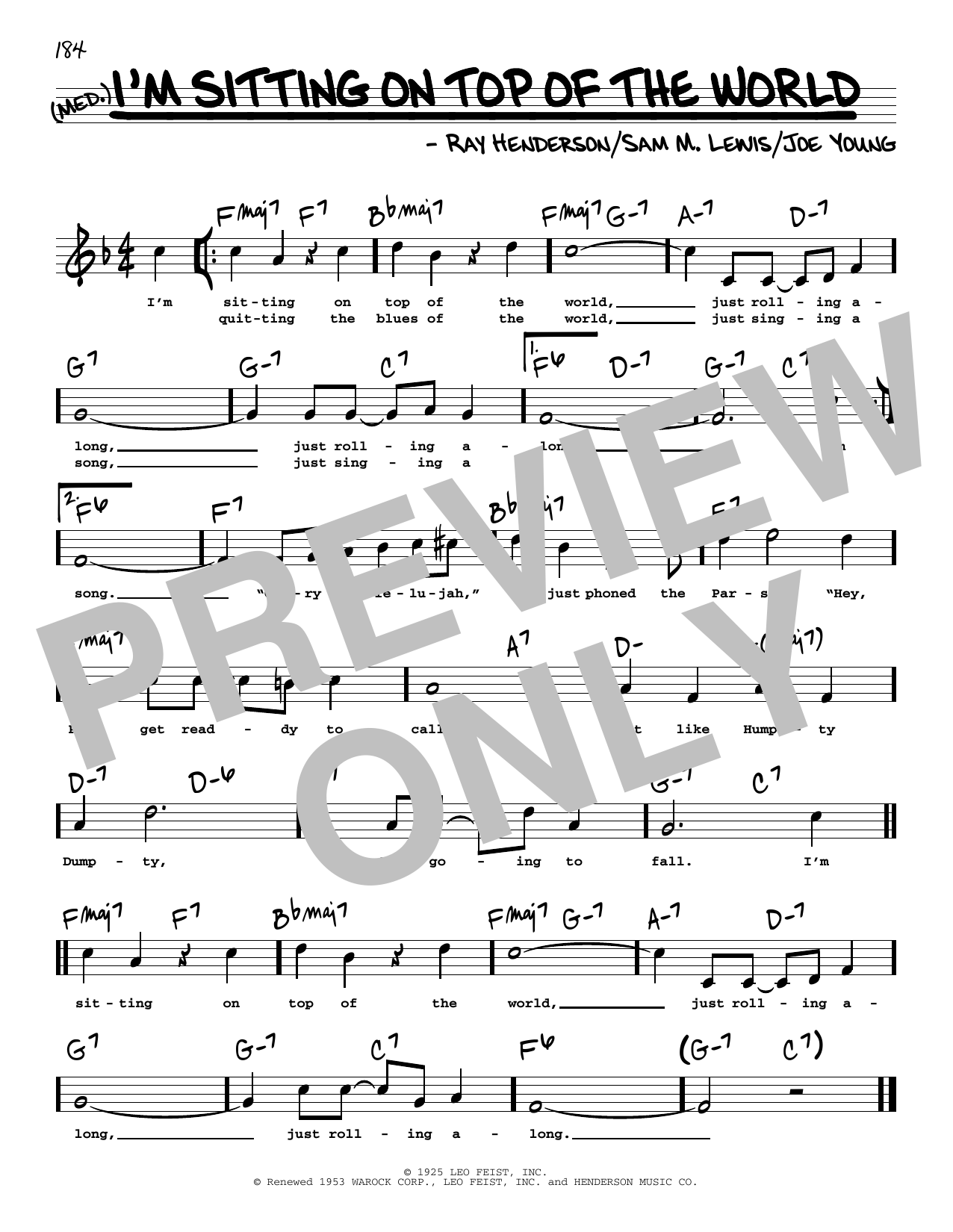 Download or print Joe Young I'm Sitting On Top Of The World (High Voice) (from The Jolson Story) sheet music, chords and digital score arranged for Real Book – Melody, Lyrics & Chords. This Standards score includes 1 page(s).