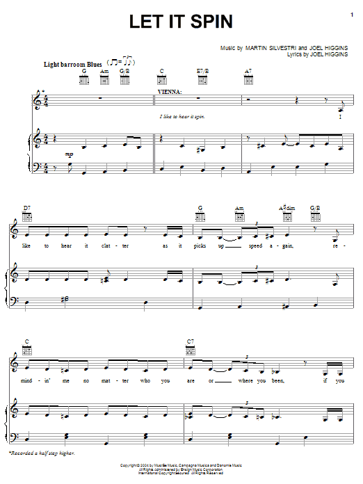 Download or print Joel Higgins Let It Spin sheet music, chords and digital score arranged for Piano, Vocal & Guitar Chords (Right-Hand Melody). This Musical/Show score includes 7 page(s).