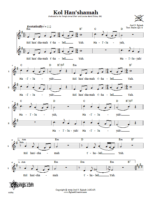 Download or print Joel N. Eglash Kol Han'shamah (May Everything That Breathes Praise God) sheet music, chords and digital score arranged for Lead Sheet / Fake Book. This Traditional score includes 2 page(s).