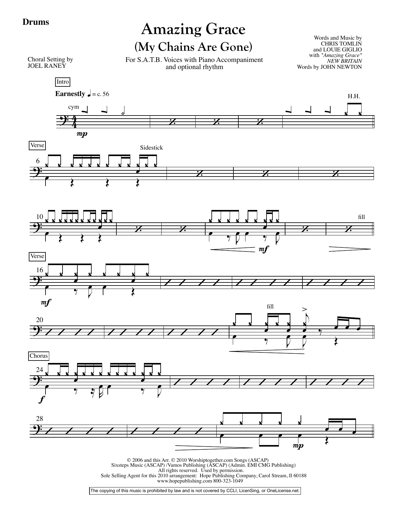 Download or print Joel Raney Amazing Grace (My Chains Are Gone) - Drums sheet music, chords and digital score arranged for Choir Instrumental Pak. This Sacred score includes 2 page(s).