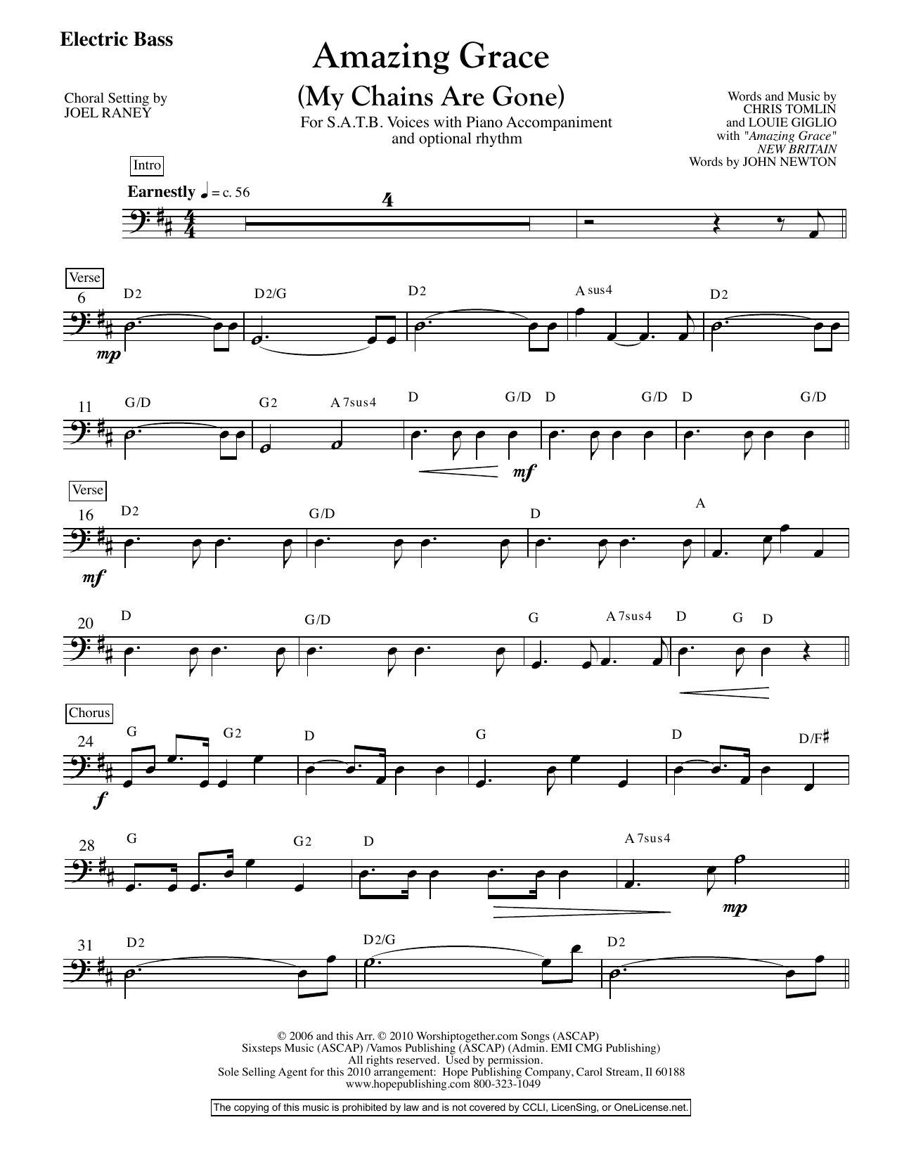 Download or print Joel Raney Amazing Grace (My Chains Are Gone) - Electric Bass sheet music, chords and digital score arranged for Choir Instrumental Pak. This Sacred score includes 2 page(s).