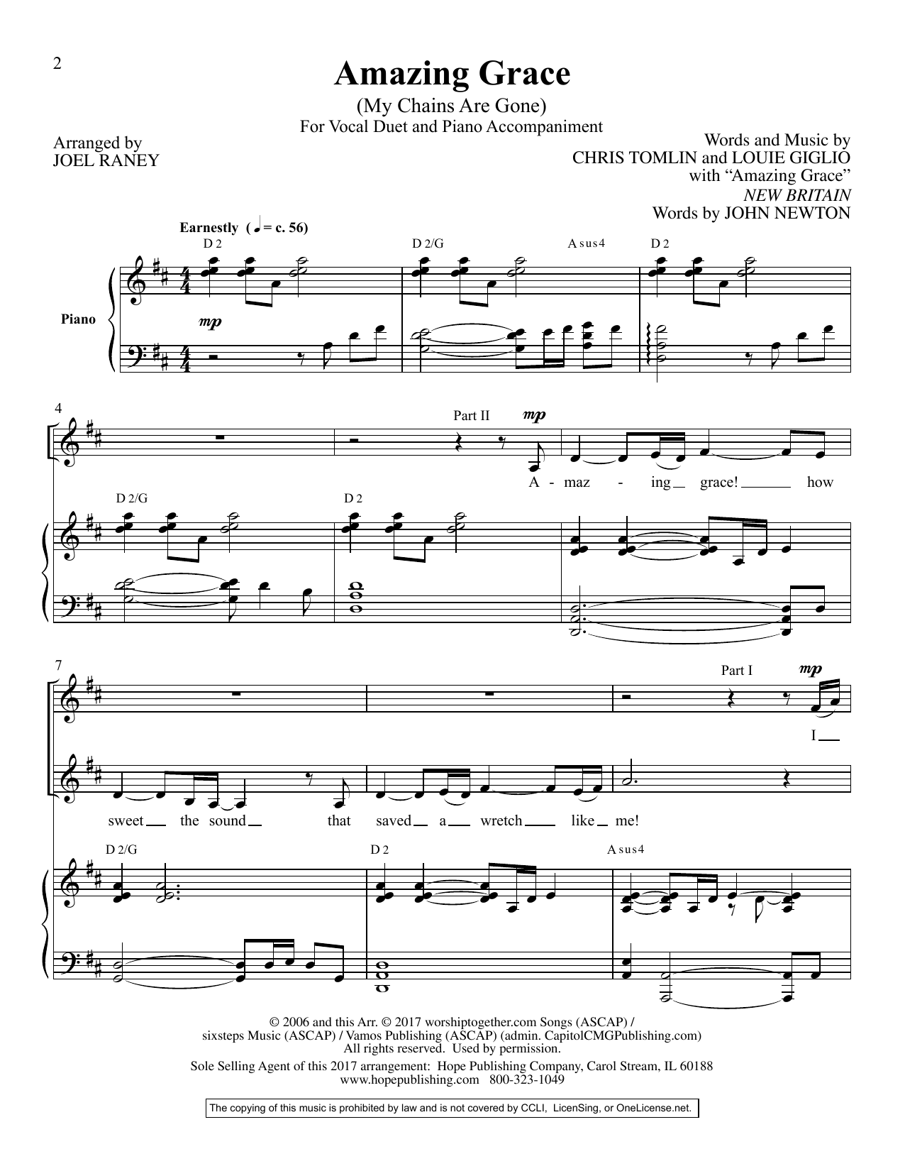Download or print Joel Raney Amazing Grace (My Chains Are Gone) sheet music, chords and digital score arranged for Piano & Vocal. This Sacred score includes 6 page(s).