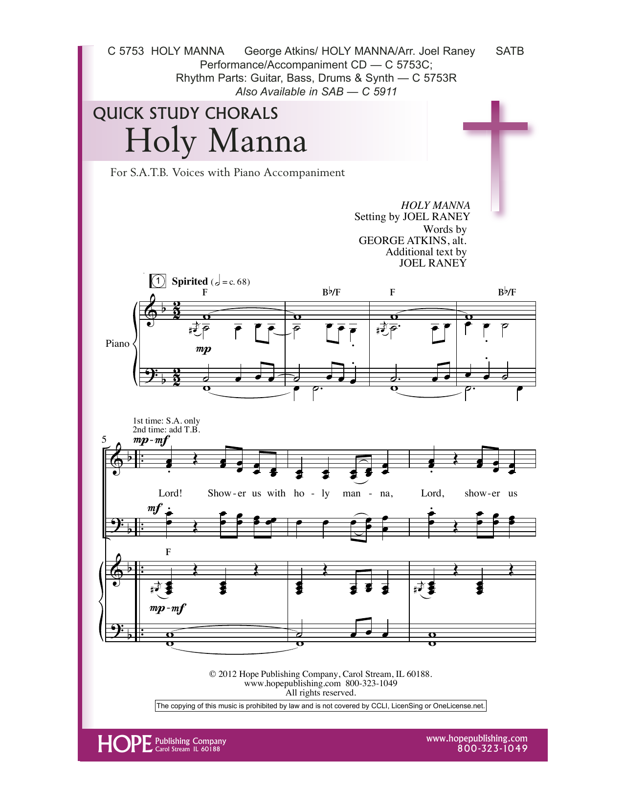 Download or print Joel Raney Holy Manna sheet music, chords and digital score arranged for 2-Part Choir. This Easter score includes 8 page(s).