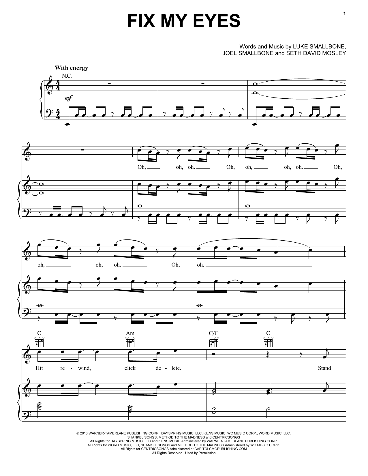 This composition is beautifuly arranged for Piano, Vocal & Guitar (Right-Hand Melody) includes 7 page(s). It is performed by Joel Smallbone. The style of the score is 'Pop'. Catalog SKU number of the notation is 157206.