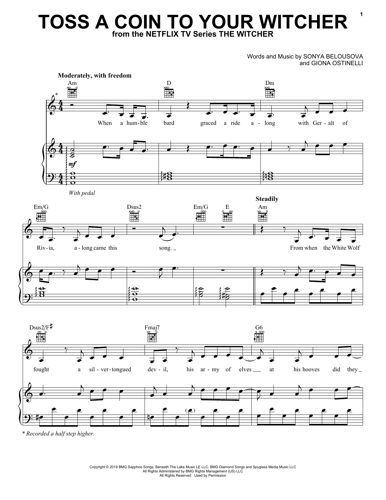 Download or print Joey Batey Toss A Coin To Your Witcher (from The Witcher) sheet music, chords and digital score arranged for Piano, Vocal & Guitar Chords (Right-Hand Melody). This Film/TV score includes 5 page(s).