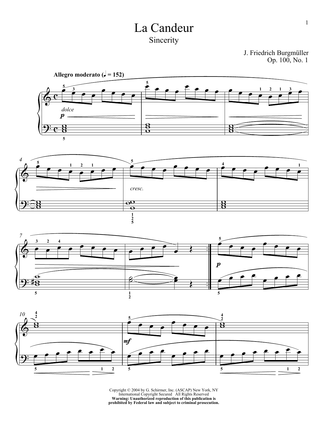 Download or print Johann Friedrich Burgmuller Sincerity (La Candeur), Op. 100, No. 1 sheet music, chords and digital score arranged for Piano Solo. This Classical score includes 2 page(s).