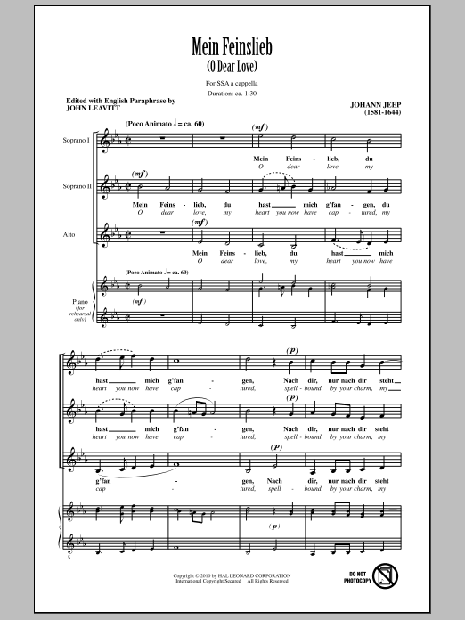 Download or print Johann Jeep O Dear Love (Mein Feinslieb) sheet music, chords and digital score arranged for SSA Choir. This Concert score includes 3 page(s).