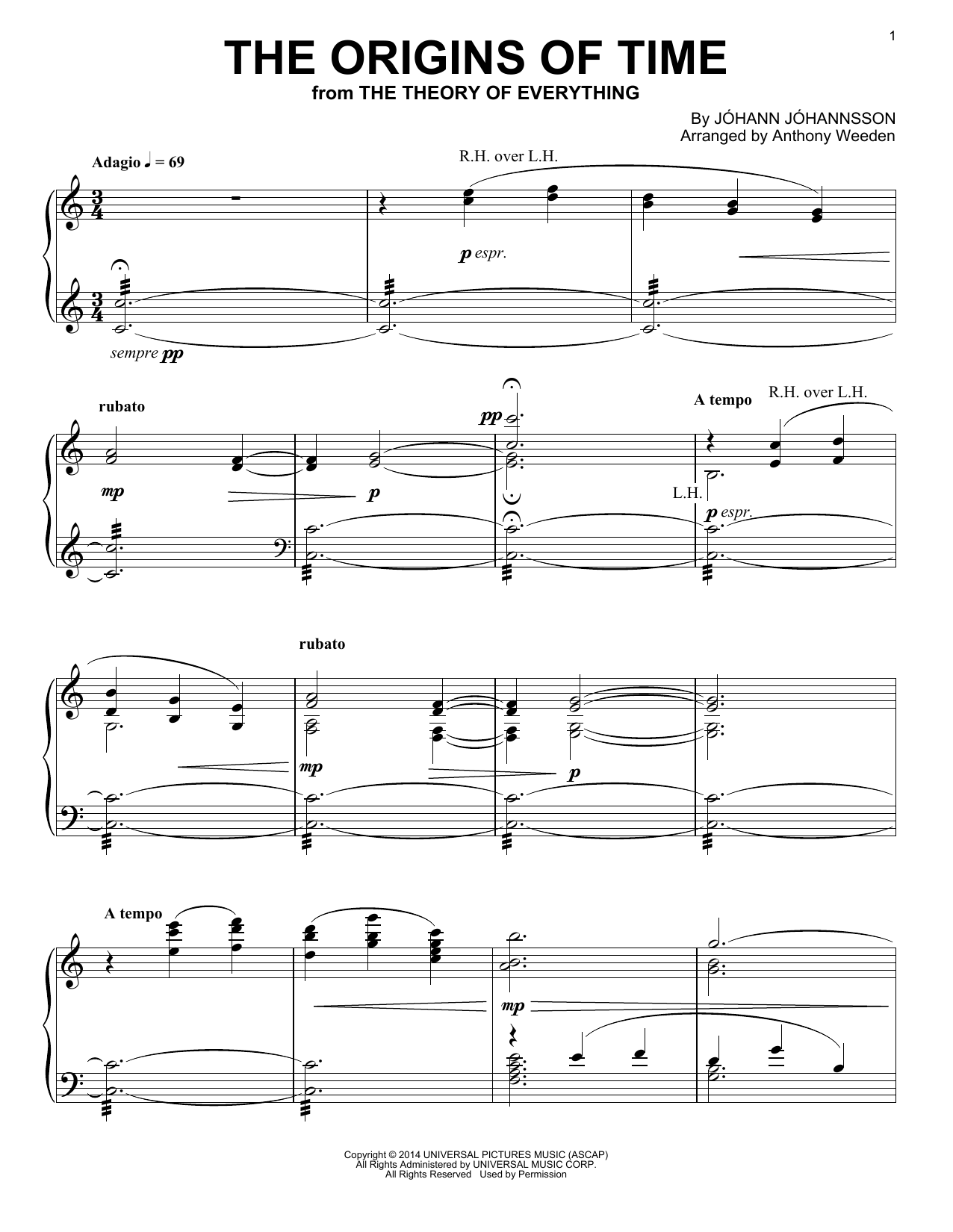 Download or print Johann Johannsson The Origins Of Time sheet music, chords and digital score arranged for Piano Solo. This Film/TV score includes 3 page(s).