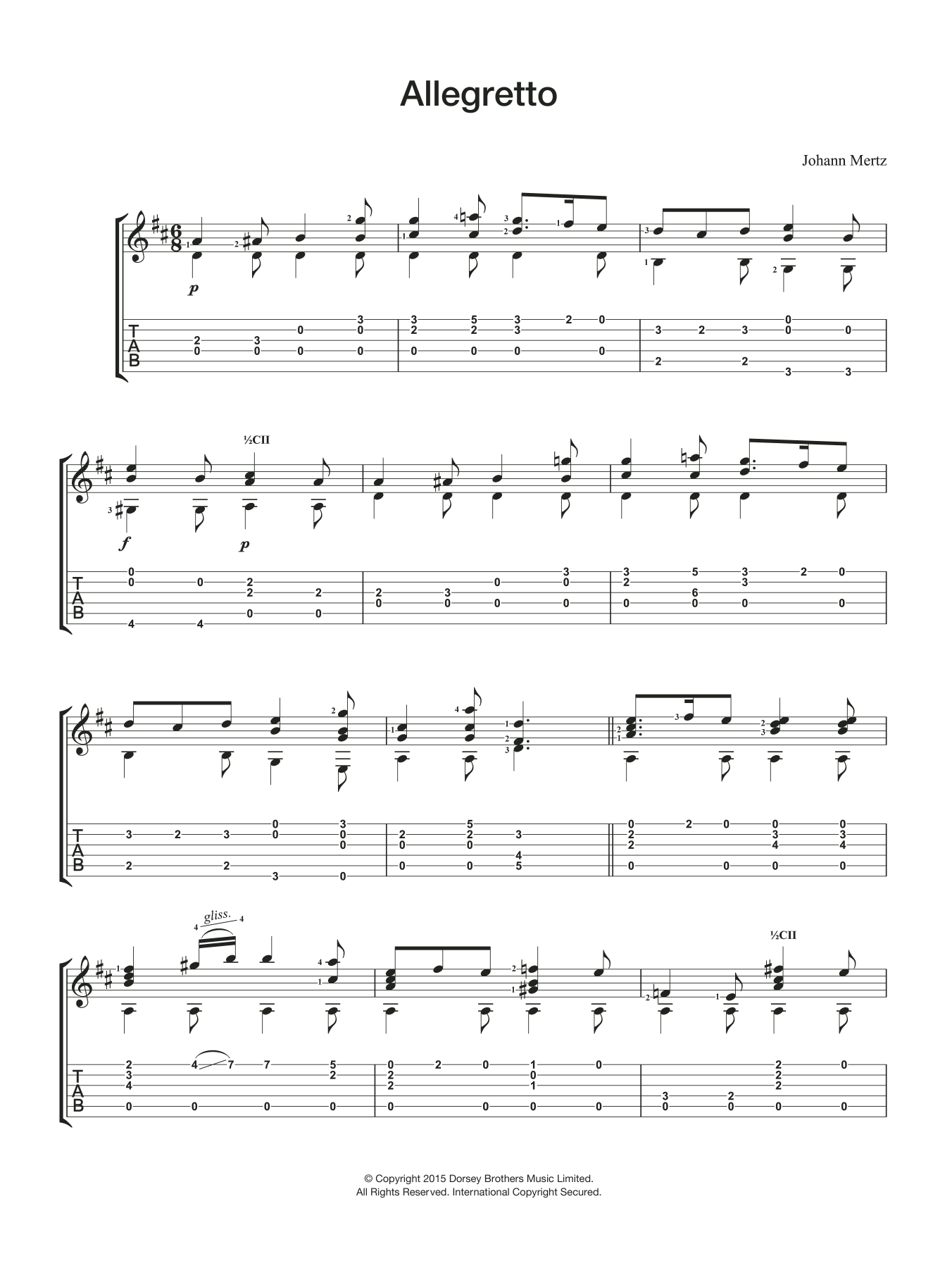Download or print Johann Kaspar Mertz Allegretto sheet music, chords and digital score arranged for Easy Guitar. This Classical score includes 2 page(s).