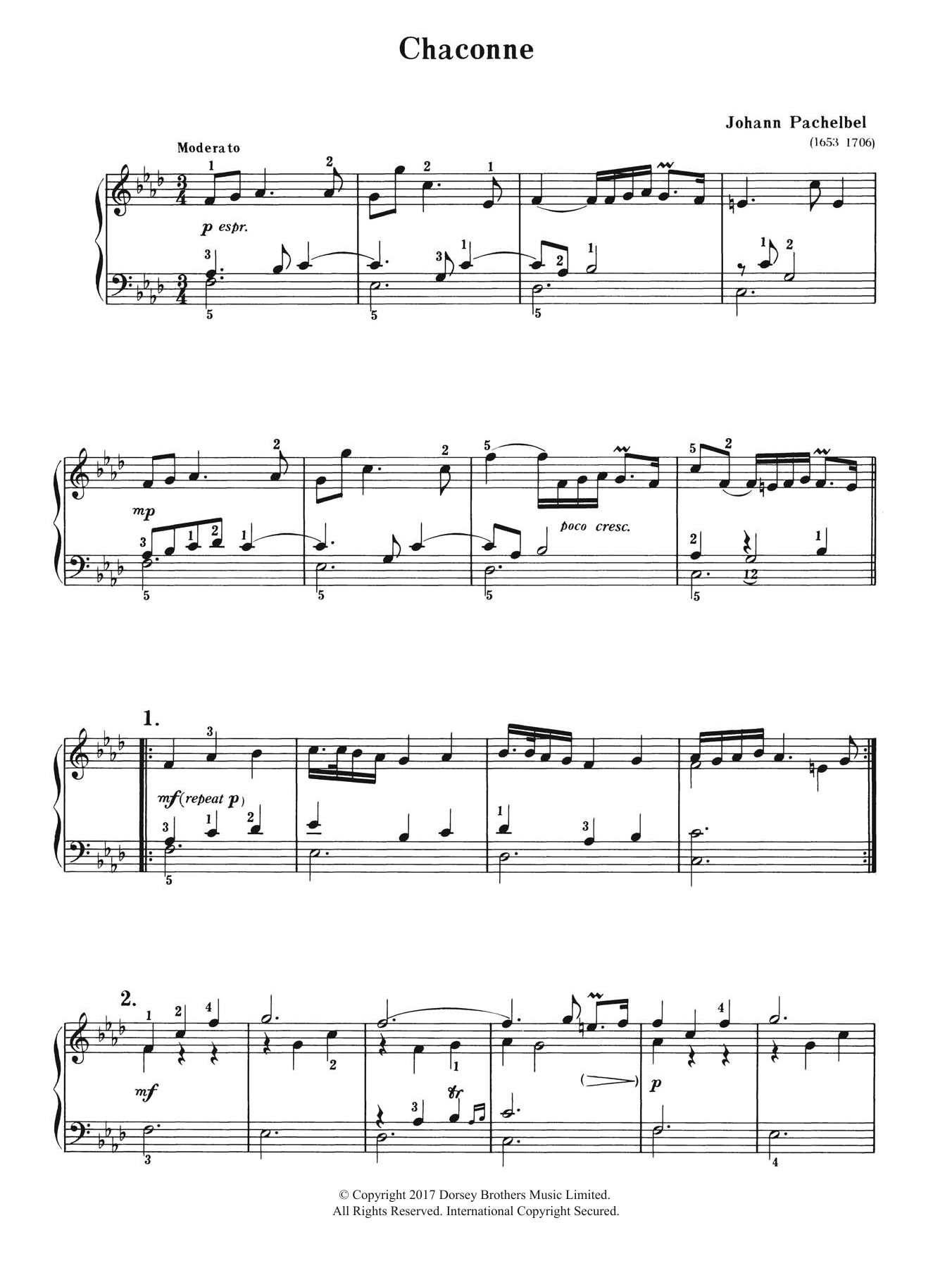 Download or print Johann Pachelbel Chaconne sheet music, chords and digital score arranged for Piano Solo. This Classical score includes 3 page(s).