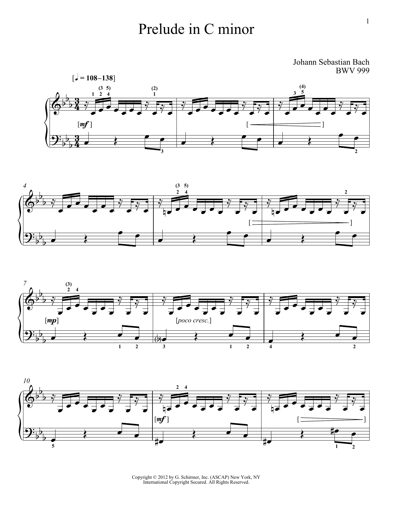 Download or print Johann Sebastian Bach Prelude In C Minor, BMV 999 sheet music, chords and digital score arranged for Piano Solo. This Classical score includes 3 page(s).