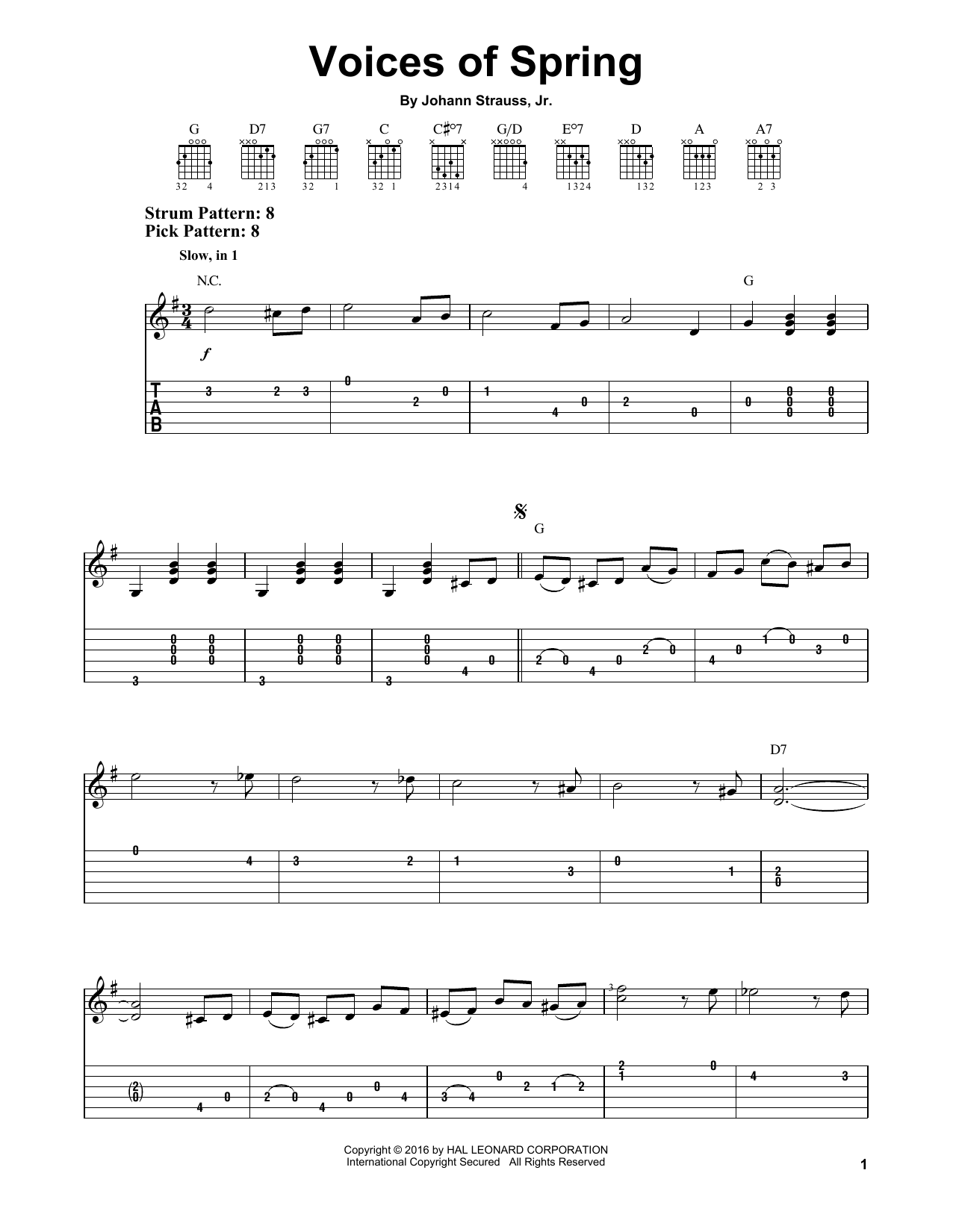 Download or print Johann Strauss, Jr. Voices Of Spring sheet music, chords and digital score arranged for Easy Guitar Tab. This Classical score includes 3 page(s).