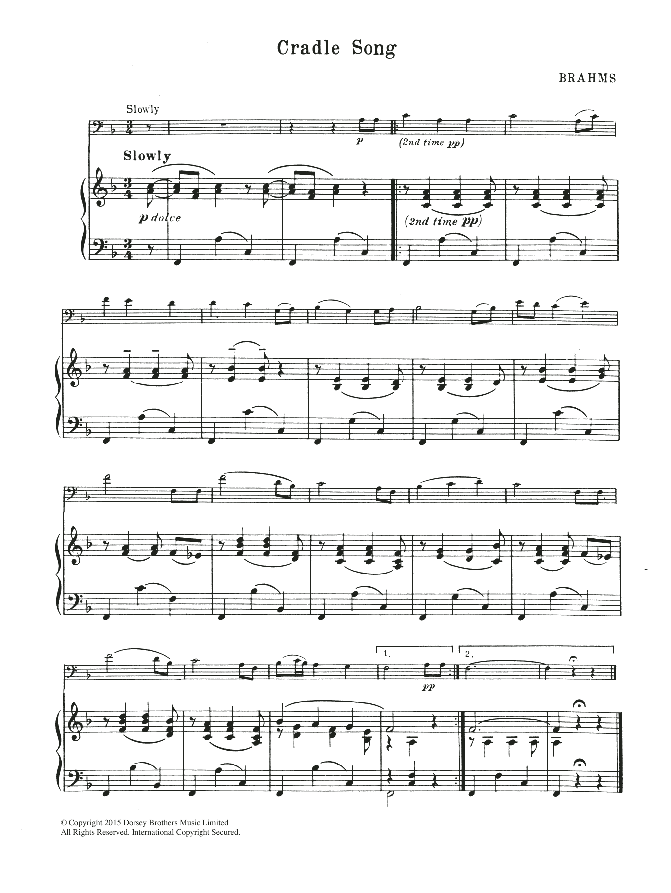 Download or print Johannes Brahms Cradle Song sheet music, chords and digital score arranged for Cello Solo. This Classical score includes 2 page(s).