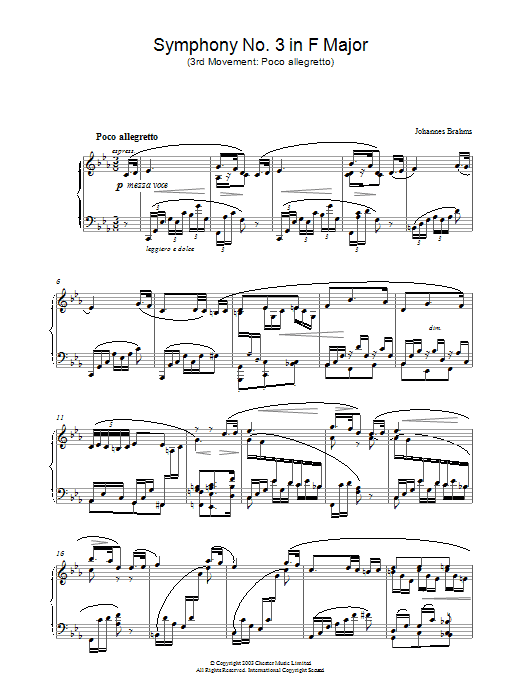 Download or print Johannes Brahms Symphony No. 3 In F Major (3rd movement: Poco allegretto) sheet music, chords and digital score arranged for Alto Sax Solo. This Classical score includes 2 page(s).