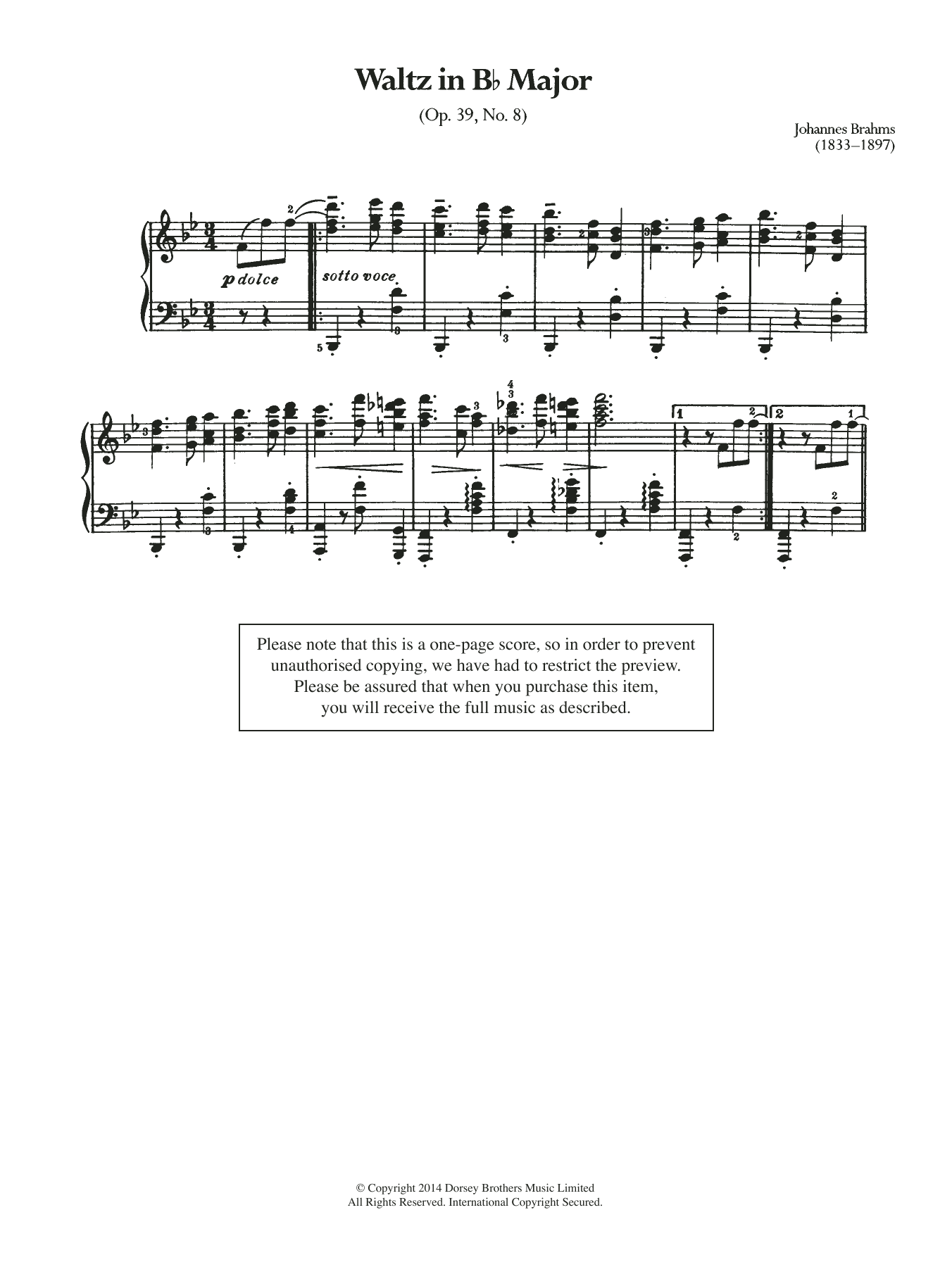 Download or print Johannes Brahms Waltz In B Flat, Op.39 No.8 sheet music, chords and digital score arranged for Piano Solo. This Classical score includes 2 page(s).