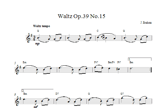 Download or print Johannes Brahms Waltz Op. 39, No. 15 sheet music, chords and digital score arranged for Piano Solo. This Classical score includes 2 page(s).