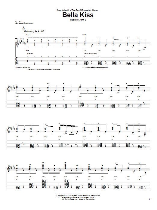 Download or print John 5 Bella Kiss sheet music, chords and digital score arranged for Guitar Tab. This Metal score includes 4 page(s).