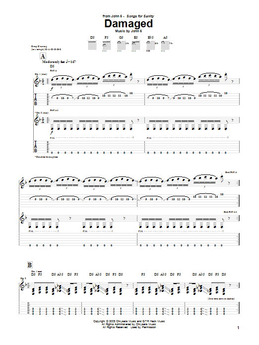 Download or print John 5 Damaged sheet music, chords and digital score arranged for Guitar Tab. This Metal score includes 10 page(s).