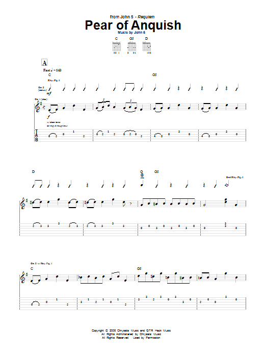 Download or print John 5 Pear Of Anquish sheet music, chords and digital score arranged for Guitar Tab. This Metal score includes 4 page(s).