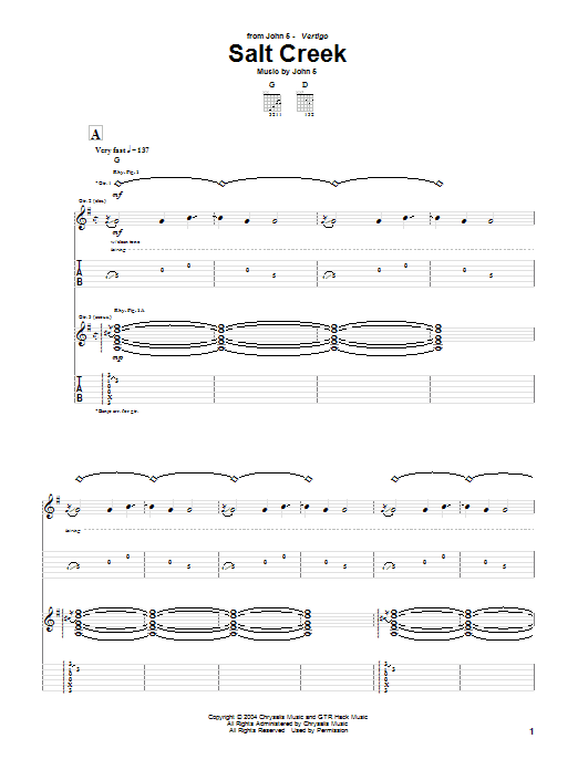 Download or print John 5 Salt Creek sheet music, chords and digital score arranged for Guitar Tab. This Metal score includes 11 page(s).