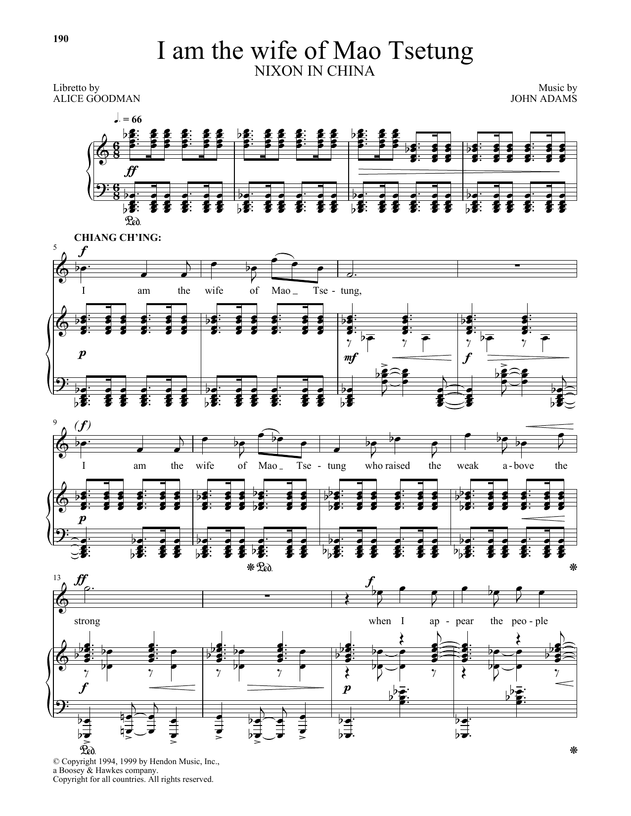 Download or print John Adams I am the wife Of Mao Tsetung (from Nixon In China) sheet music, chords and digital score arranged for Piano & Vocal. This Classical score includes 12 page(s).