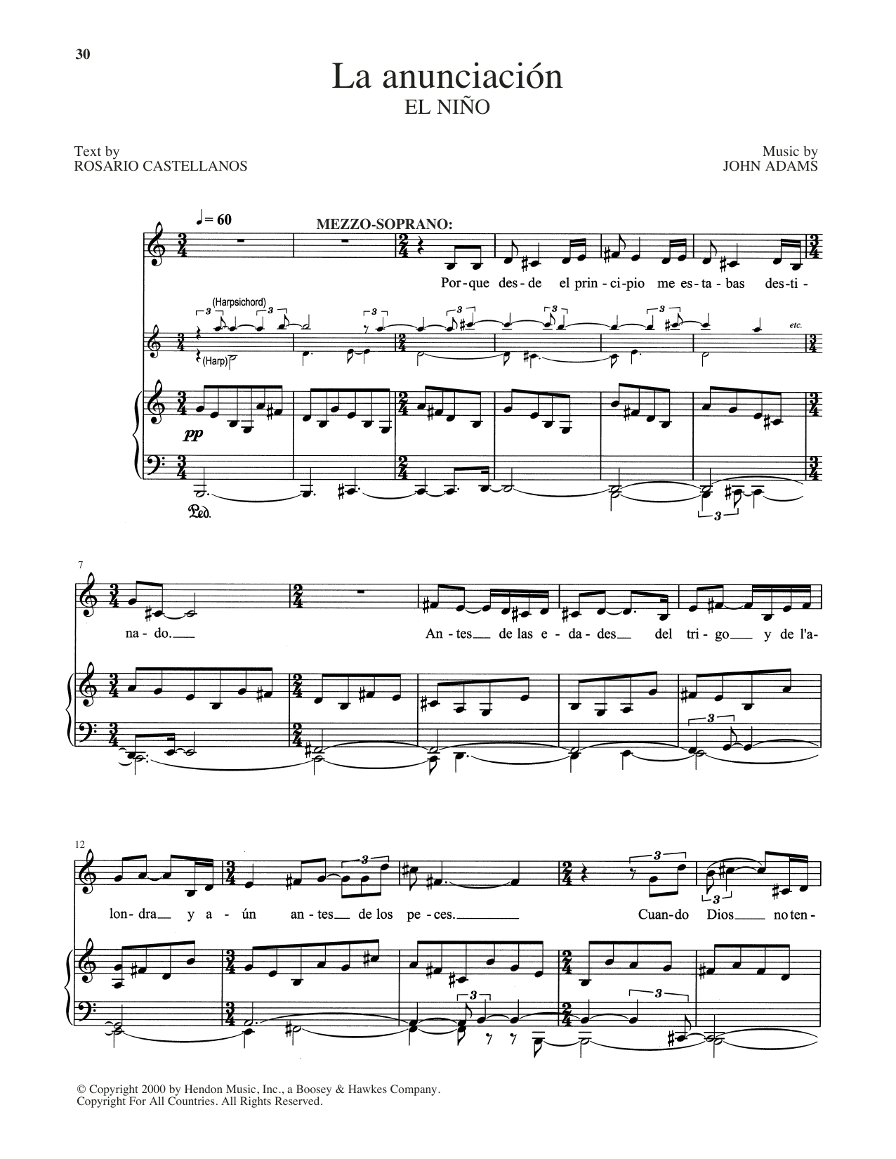 Download or print John Adams La Anunciacion sheet music, chords and digital score arranged for Piano & Vocal. This Classical score includes 16 page(s).