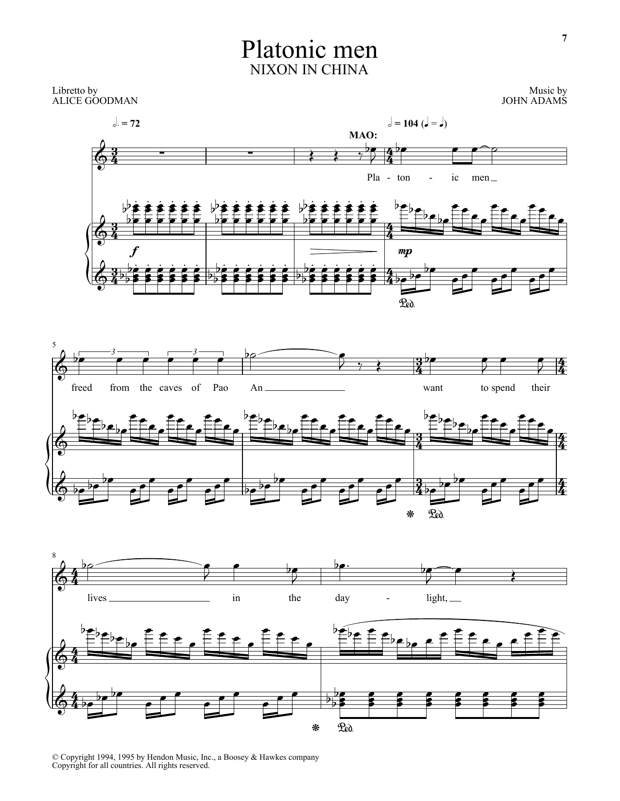 Download or print John Adams Platonic men (from Nixon In China) sheet music, chords and digital score arranged for Piano & Vocal. This Classical score includes 5 page(s).