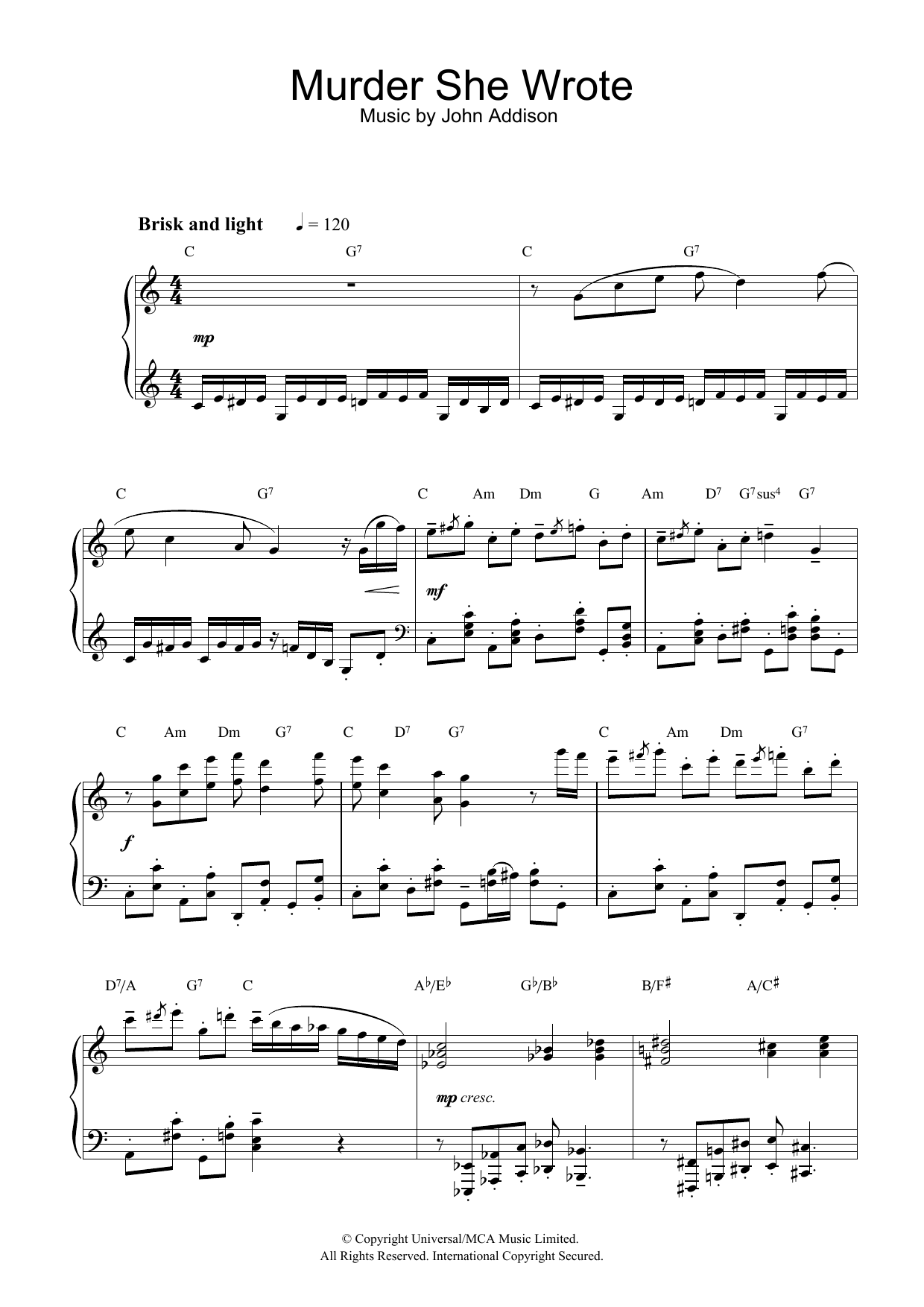 Download or print John Addison Murder She Wrote sheet music, chords and digital score arranged for Piano Solo. This Film/TV score includes 3 page(s).