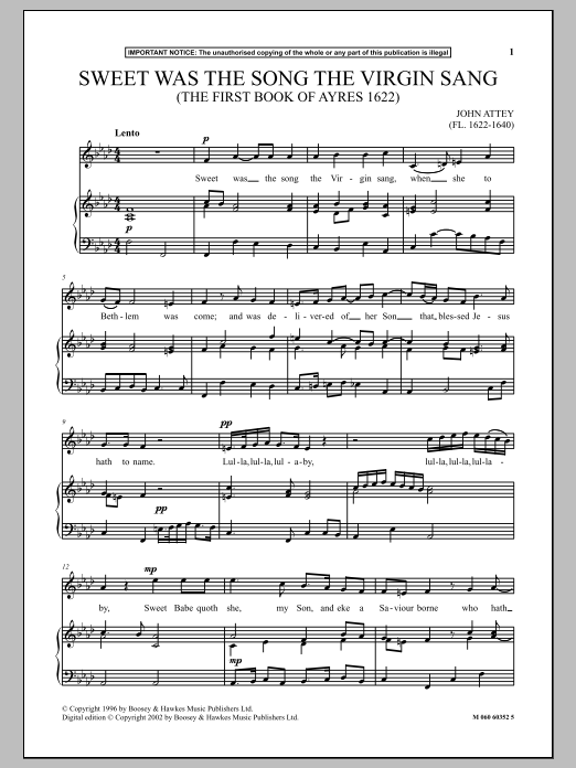 Download or print John Attey Sweet Was The Song The Virgin Sang (The First Book Of Ayres 1622) sheet music, chords and digital score arranged for Piano & Vocal. This Classical score includes 2 page(s).