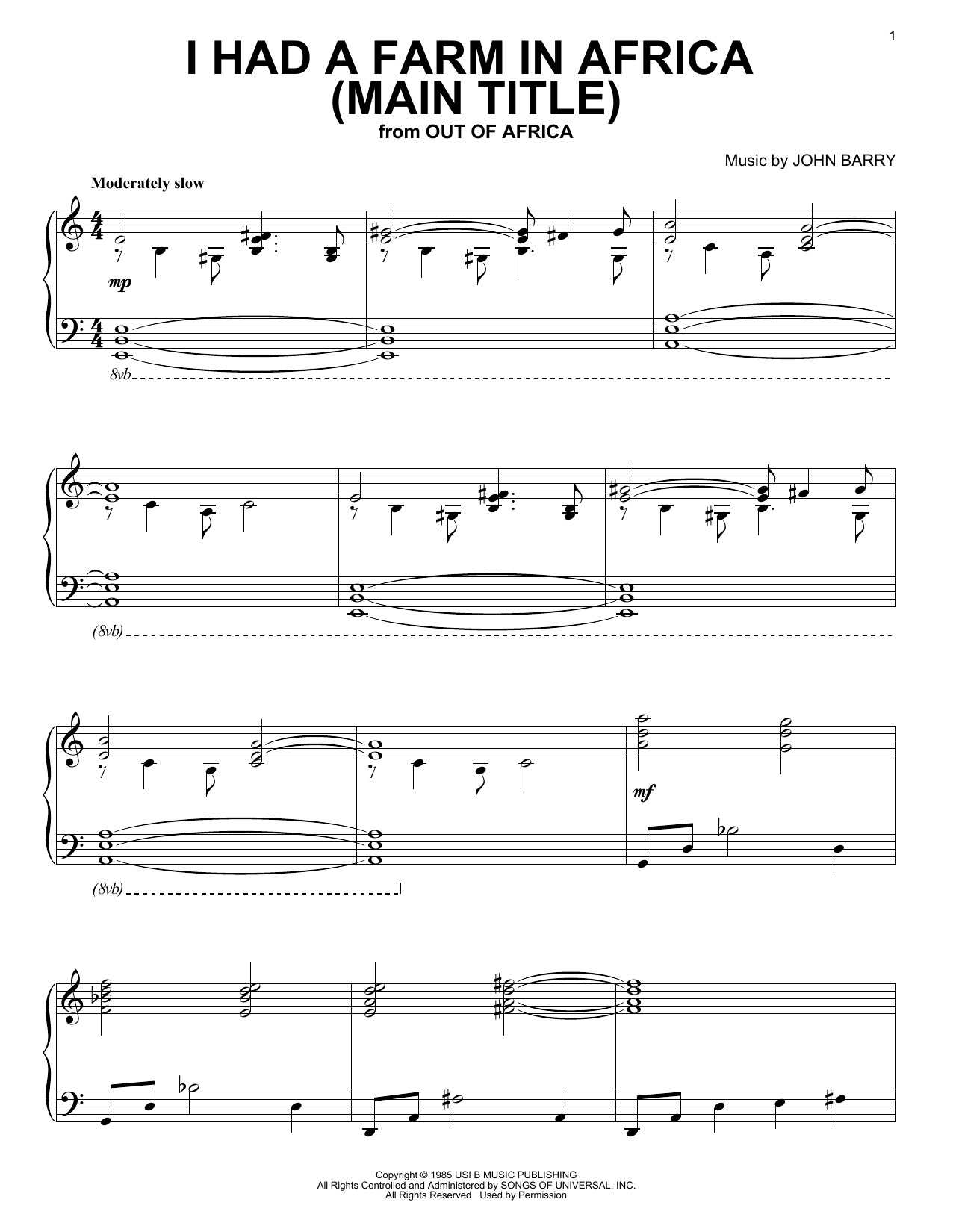Download or print John Barry I Had A Farm In Africa (Main Title) (from Out Of Africa) sheet music, chords and digital score arranged for Piano Solo. This Film/TV score includes 4 page(s).