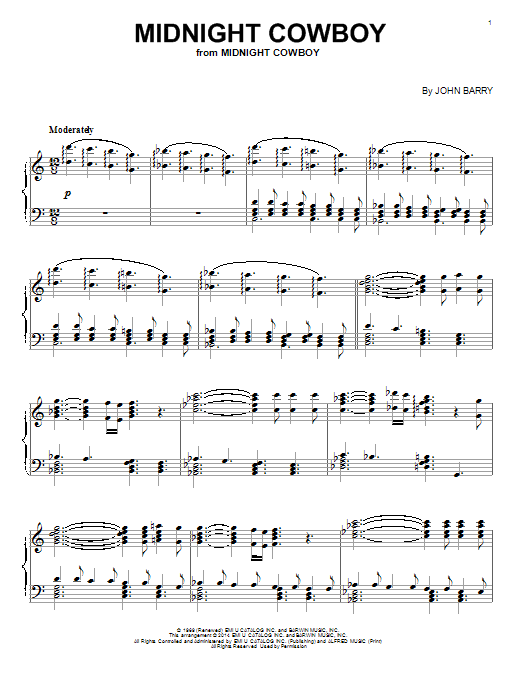 Download or print John Barry Midnight Cowboy sheet music, chords and digital score arranged for Piano Solo. This Film/TV score includes 2 page(s).
